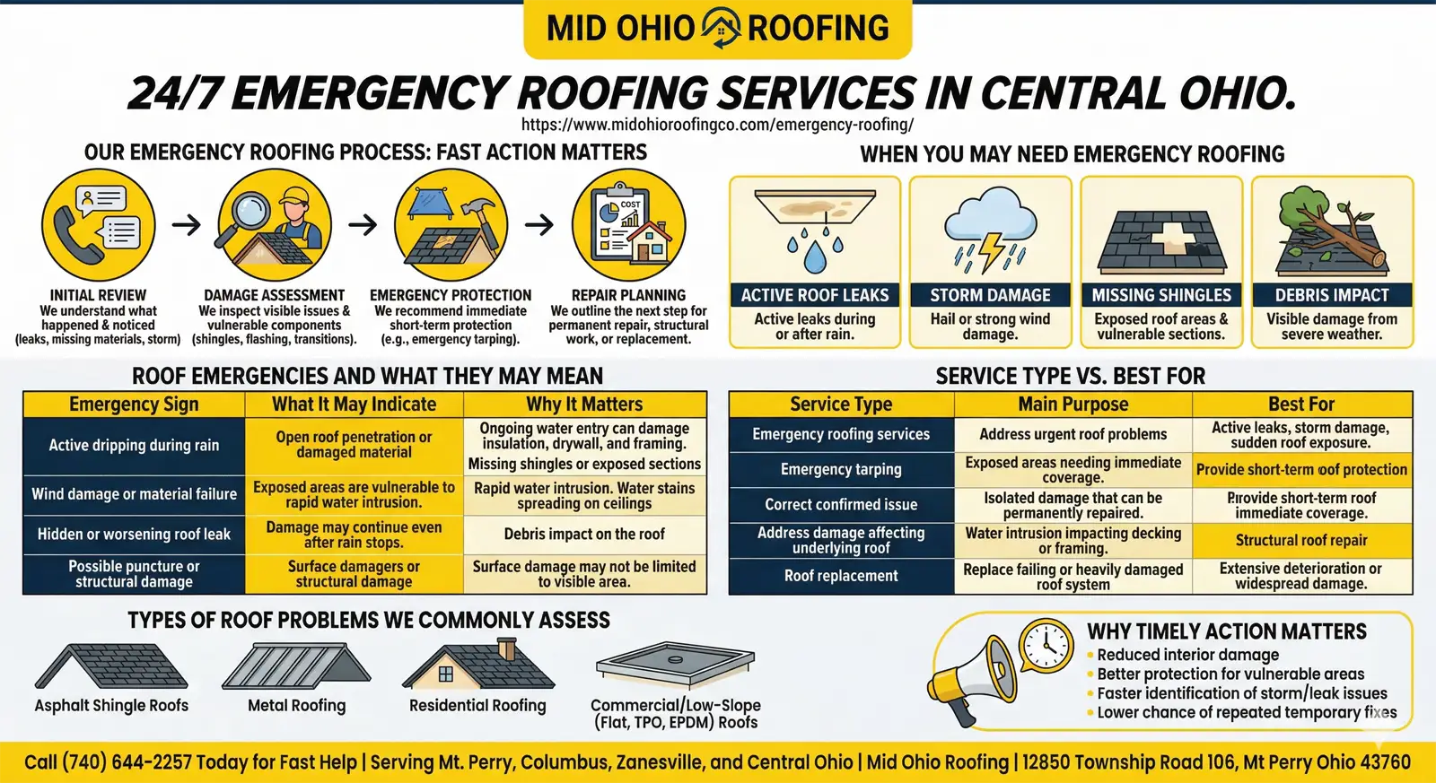 Yes. Mid Ohio Roofing provides emergency roofing services for both residential and commercial roofing systems, with the assessment based on the roof type, materials, and visible damage.