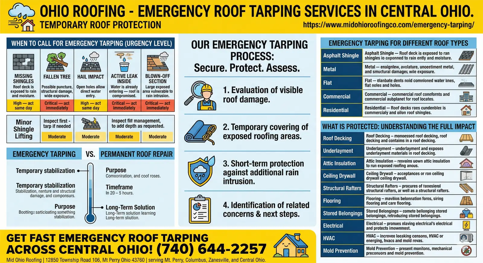 Understanding which roof damage situations call for emergency tarping helps Ohio property owners make faster, more confident decisions when severe weather or sudden damage strikes. This reference guide covers the most common emergency tarping scenarios Mid Ohio Roofing responds to across Central and Southeast Ohio.