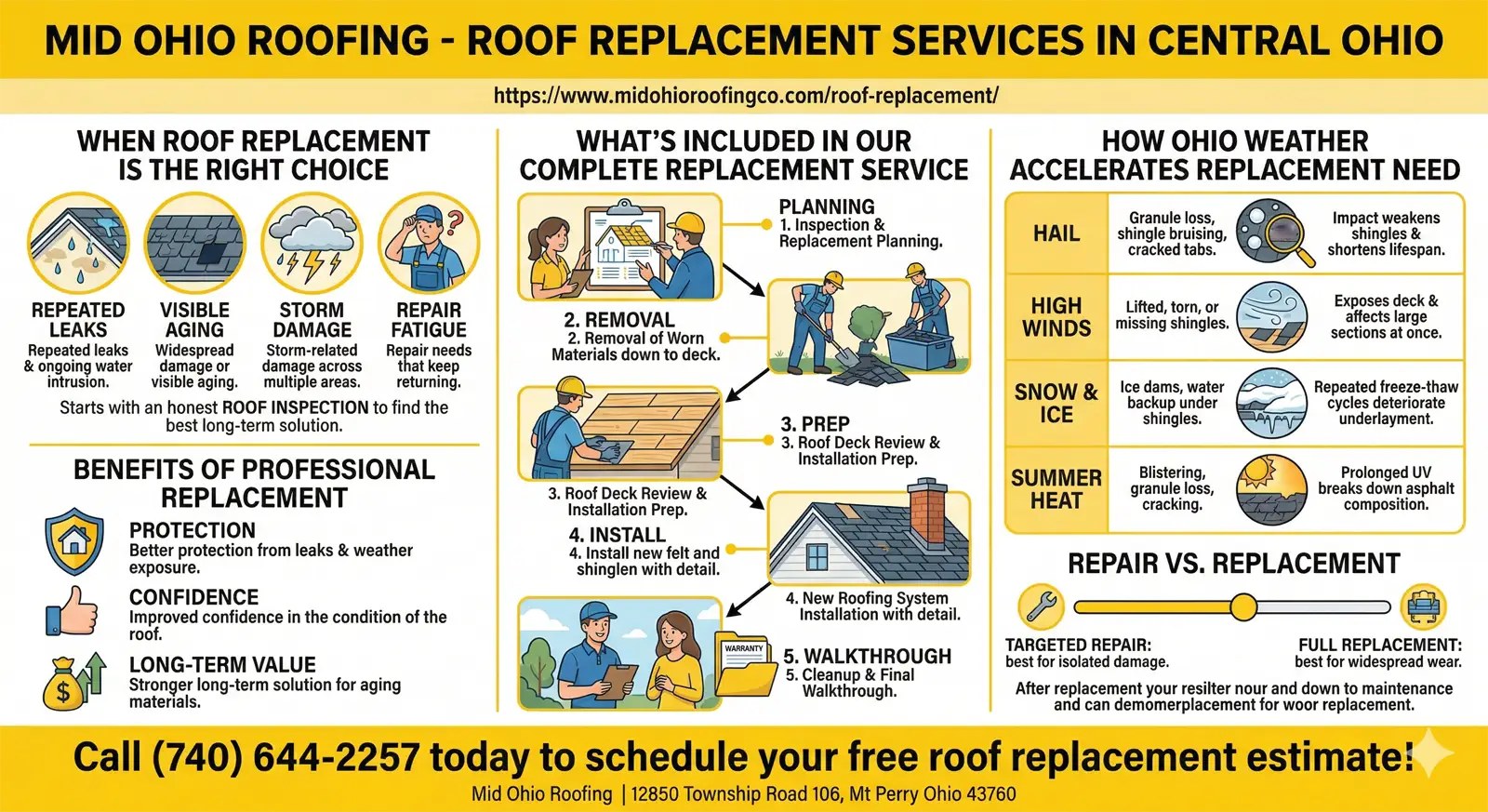 Roof replacement services help protect your home when repairs are no longer enough to restore reliable performance. Mid Ohio Roofing provides roof replacement services for homeowners dealing with aging roofs, repeated leaks, storm damage, or widespread wear. As a trusted Ohio roofing contractor, we bring 25+ years of experience, family-owned service, full insurance coverage, and a strong focus on craftsmanship, clear communication, and roofing systems built for long-term performance.