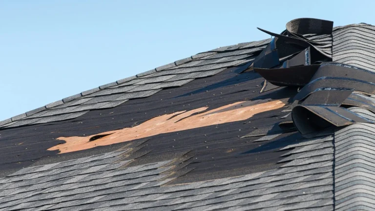 - Visible Shingle “Blow-Offs”: Seeing patches of black underlayment or the wooden roof deck means shingles have been completely removed. This requires an immediate roof inspection to stop interior water damage.
