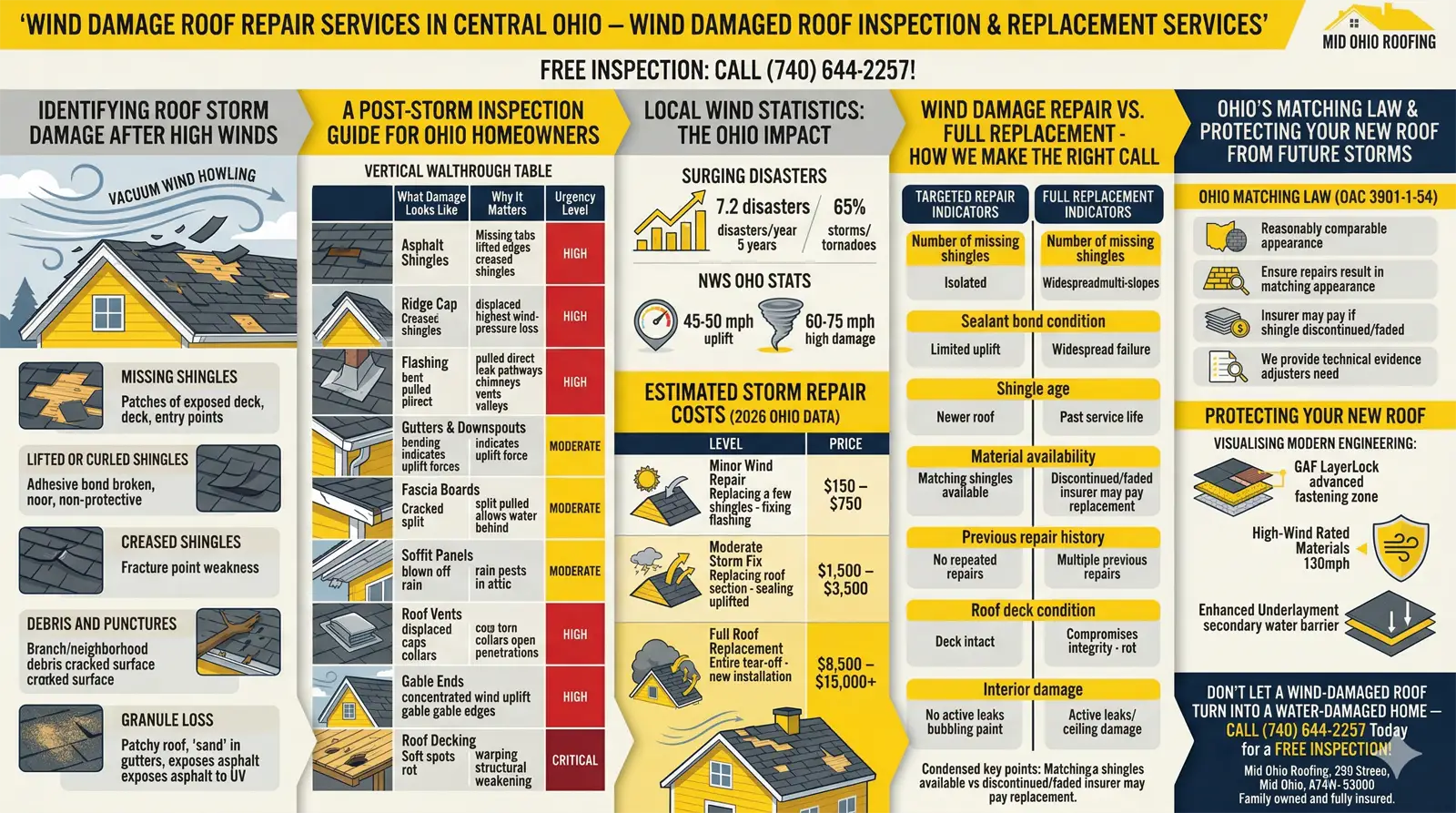 Wind Damage Roof Repair vs. Full Replacement — How Mid Ohio Roofing Makes the Right Call
